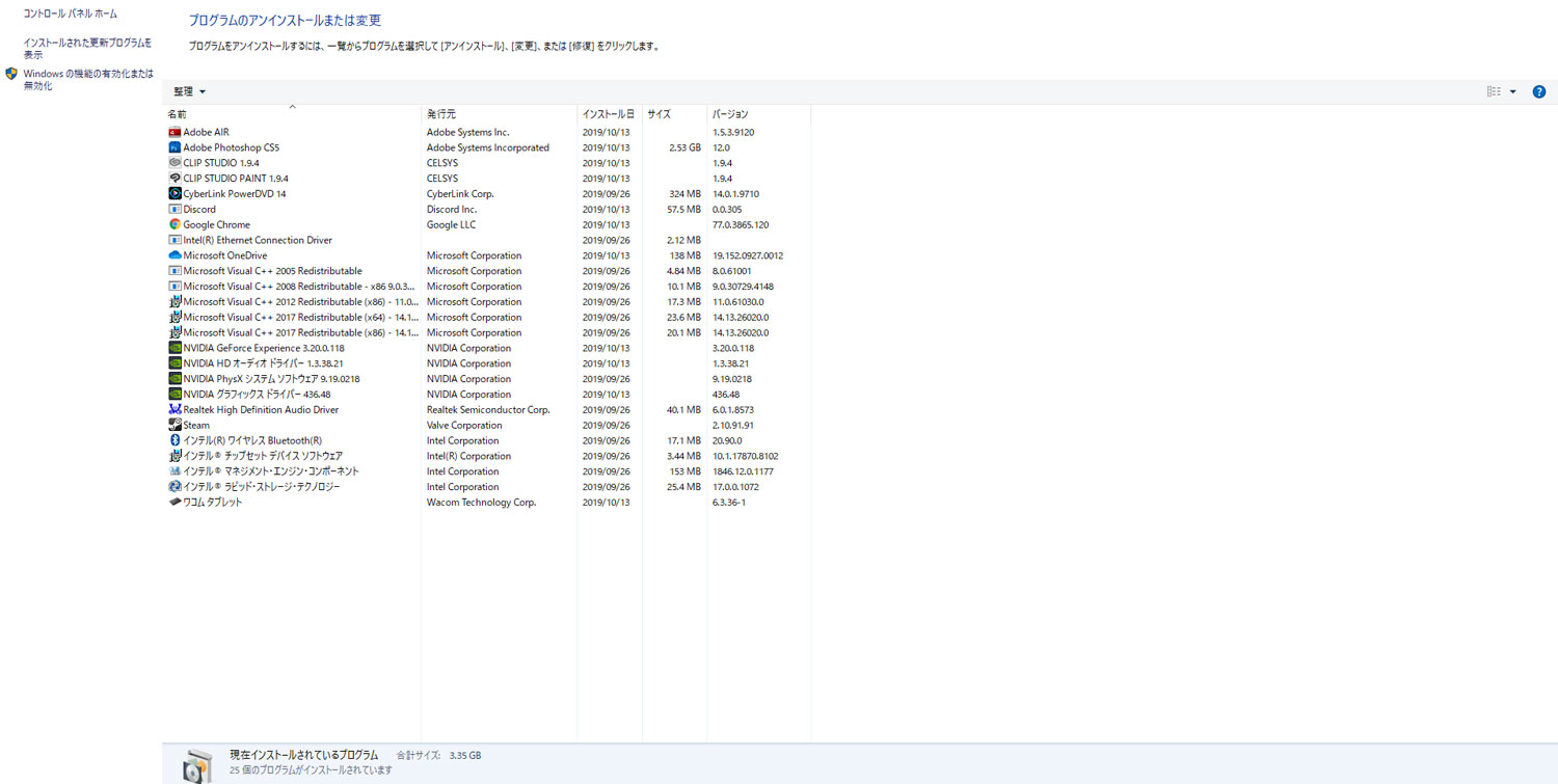 (プログラムと機能)]を選択して表示される画面のすべての項目が