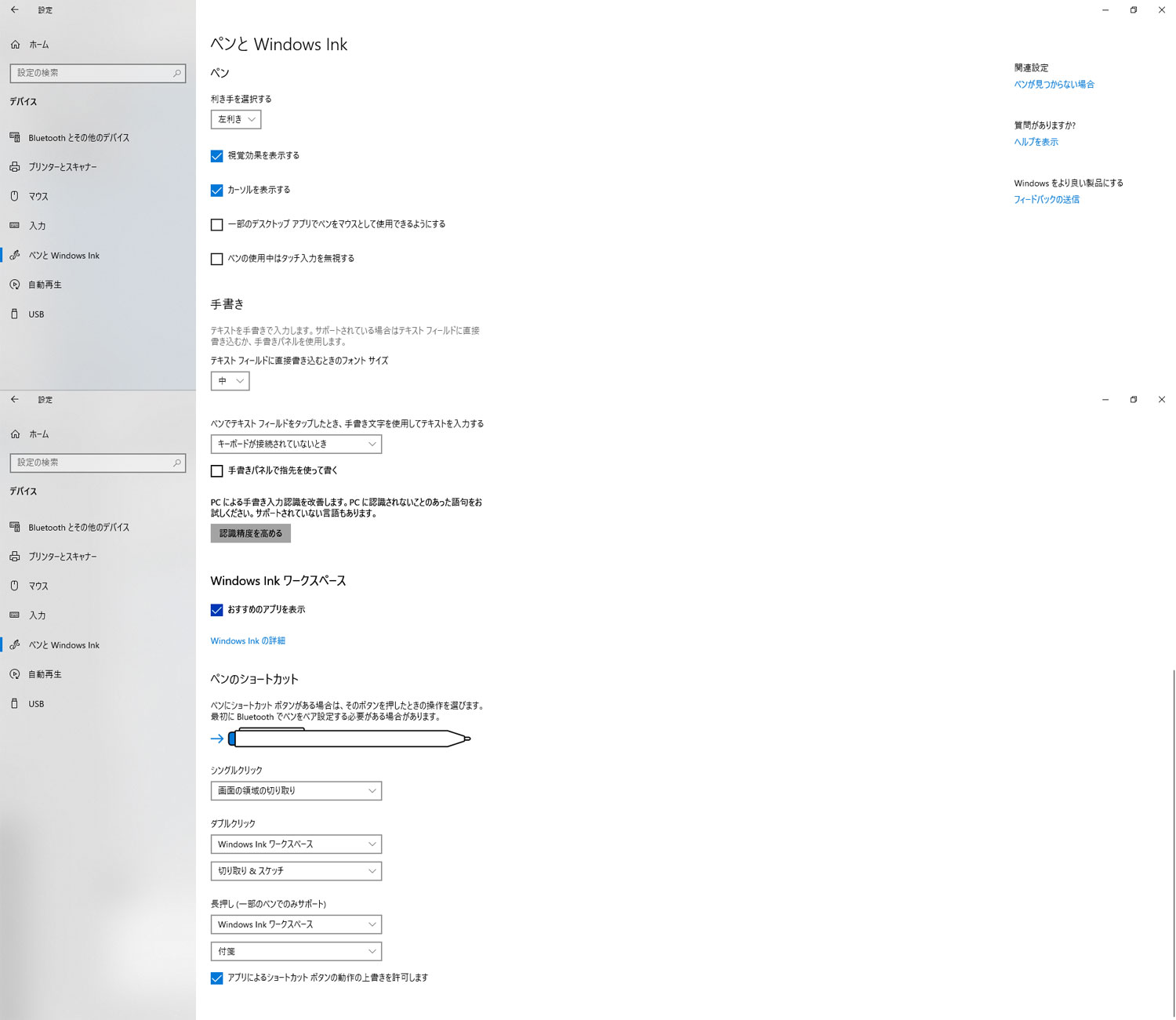 ・[Windowsスタート]→[設定]→[デバイス]と選択し、表示される画面の左側で[ペンとWindows Ink]の順に選択すると表示されるページのすべての項目が確認できるようスクリーンショットを取得し、掲載ください。