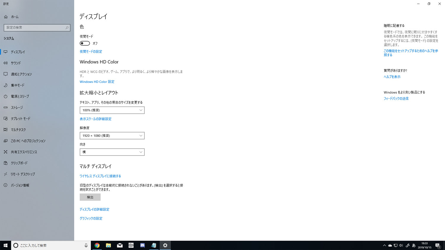 ・デスクトップ画面の何もない所で右クリックして頂き、表示されるメニューで [ディスプレイ設定]を選択して、表示される画面の内容が確認できるようスクリーンショットを撮影し、掲載下さい。