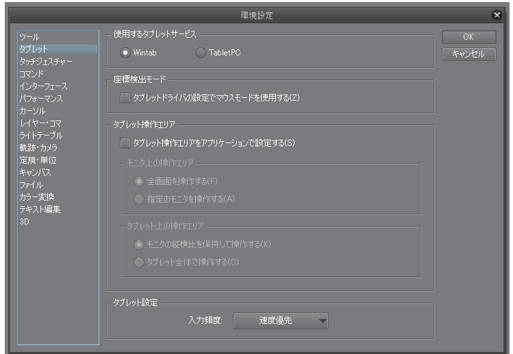 ・CLIP STUDIO PAINTを起動し、[ファイル]メニュー→[環境設定]を選択して、表示される画面左側で以下の項目を選択した状態の画面のスクリーンショットを撮影し、掲載下さい。
