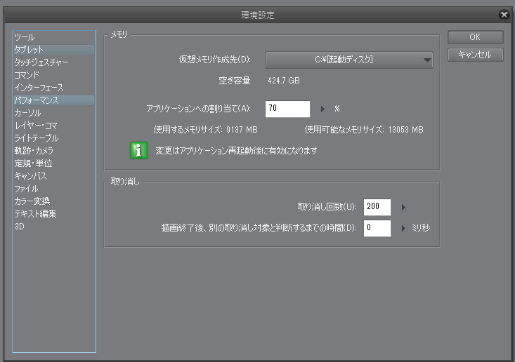 ・CLIP STUDIO PAINTを起動し、[ファイル]メニュー→[環境設定]を選択して、