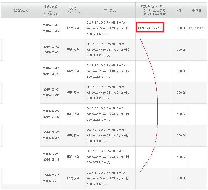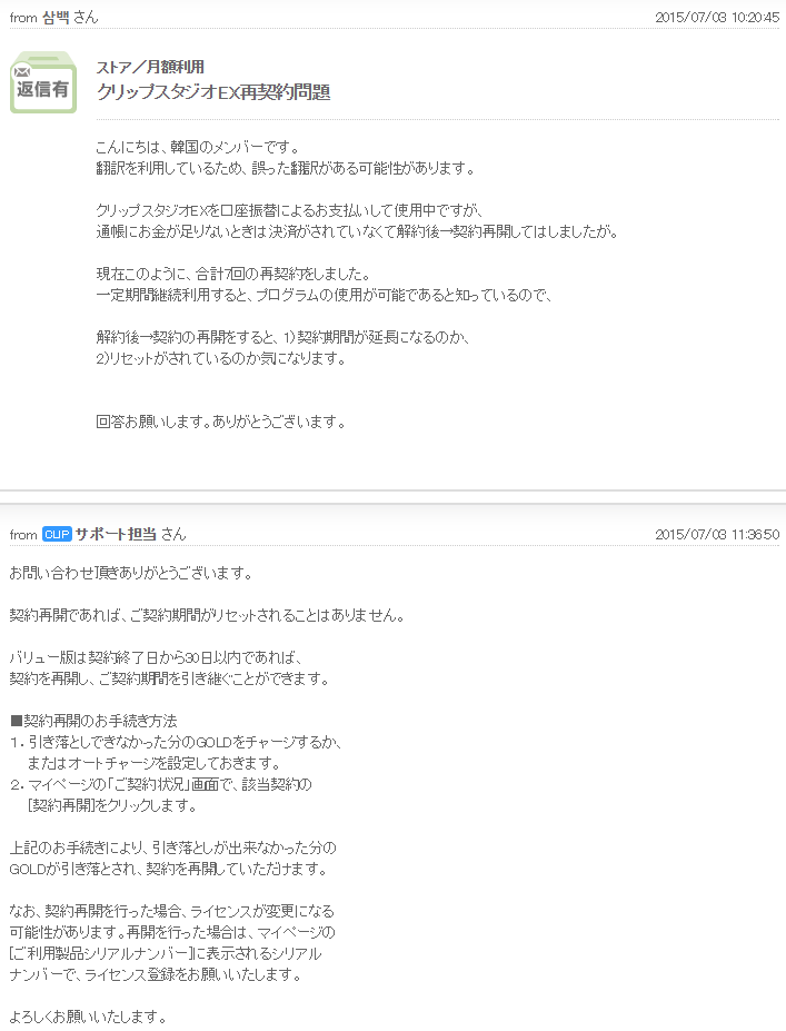こんにちは、前回のような問題にお問い合わせいただいたメンバーです。 合計2つの質問を上げたが - 最初の質問は「契約解除」後「契約再開」も期間が続くかどうかのことでした。 - 二つめの質問は下の写真に示すように、契約解除された期間は、含まれていができないされるのに対し、お問い合わせ差し上げたんですけど。 回答を以下の通りでした。 (↓) ![]() ![]() これを見て私は「解約」の後、「契約再開」も期間が続くと思ったし、 シリアル贈呈がバリュー版50ヶ月使用時に贈呈に変わる前(より少ない期間)として知られて契約を開始したので、クリップスタジオEX日本語版をそのまま使用したつもりです。 つながらないという事実を知っていれば、数回のセール期間があったとき、英語版を買ったのです。 翻訳のエラーなのか意味が正しく伝わらないように思える切なく契約問題をよく知らなかったてあまりにも悲しいです。 期間がつながる措置してくれることはありませんか? 学生とコスト的な問題が大きく、本当に効きます...してくださいお願いします。 ------------------------------------------------------------ ■バージョン: ※右上の[?]アイコンをクリック後に[バージョン情報]で確認できます。 ■OS Windows XP( ) Windows Vista( ) Windows 7 ( ) Windows 8( ) Windows 8.1( ) Windows 10( ) MacOS X 10.5( ) MacOS X 10.6( ) MacOS X 10.7( ) MacOS X 10.8( ) MacOS X 10.9( ) MacOS X 10.10( ) MacOS X 10.11( ) その他( ) ------------------------------------------------------------ |