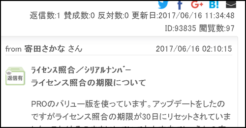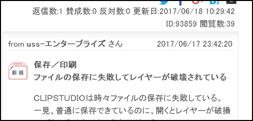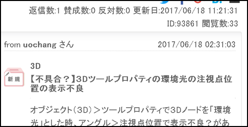 ※ 以下に示すURLは、全て「CLIP STUDIO PAINT」の「要望・不具合ボード」のものです。 ------------------------------ ◎ 返信数と「返信有」のアイコン関係 私の記憶が正しければ、質問がなされた直後はアイコンは「新規」となっており、サポート担当さんがコメントした時点でアイコンは「返信有」に変わったと思います。そしてサポート担当さんが、そのスレッドの初めてのコメンテーターだった場合は、返信数は「1」と記載されます。 サポート担当さんが最初にコメントをつけるより前に、スレ主もしくは他のユーザーがコメントをつけた場合には、アイコンは「新規」のままで、返信数の部分は実際のコメントの数が表示されたと思います。 たとえば下記のURL(以下、スレッドA)では、上記の説明のようになっています(2017年6月18日午後1時30分現在) https://www.clip-studio.com/clip_site/support/request/detail/svc/54/tid/93835 ![]() しかし同時刻現在、下記の二つのURL(以下、スレッドB、C)では、サポート担当さんがそのスレッドで一番最初に一つのコメントをつけているにもかかわらず、アイコンは「新規」のままです。もちろん返信数は「1」です。 ※ 下記画像の「アイコン」「返信数」、一番右端の「更新日」をご確認ください。更新日は実際にサポート担当さんが1番目にコメントをつけた日時と一致します。つまり返信数の「1」は、サポート担当さんがつけたコメントを指す事になります。 https://www.clip-studio.com/clip_site/support/request/detail/svc/54/tid/93861 ![]() https://www.clip-studio.com/clip_site/support/request/detail/svc/54/tid/93859 ![]() 今までだったら、とにもかくにもサポート担当さんがコメントを付けた時点で、アイコンは「返信有」になるはずなのに……。 これは不具合でしょうか? ------------------------------- ◎ サポート担当さんのコメントのヘッダ部分について またサポート担当さんのつけたコメントのヘッダには「from CLIPサポート担当さん」と表示があり「CLIP」の部分の背景が青い色になっているのが普通だと思います。 スレッドAではそうなっています。 ![]() しかしスレッドBとCでは「from サポート担当 さん」としか表示がなく、「CLIP」の文字もなければ青い背景もありません。 ![]() ![]() これも仕様が変わったのでしょうか? --------------------------------- 添付した画像は全て、2017年6月18日の午後1時30分頃にキャプチャーしたものです。 ---------------------------------------------------- ■Webブラウザ InternetExplorer7( ) InternetExplorer8( ) InternetExplorer9( ) InternetExplorer10( ) Internet Explorer11( ) Microsoft Edge( ) Firefox( ) Google Chrome( ) Safari( ) その他( ) ■OS Windows XP( ) Windows Vista( ) Windows 7 ( ) Windows 8( ) Windows 8.1( ) Windows 10( ) MacOS X 10.5( ) MacOS X 10.6( ) MacOS X 10.7( ) MacOS X 10.8( ) MacOS X 10.9( ) MacOS X 10.10( ) MacOS X 10.11( ) mac OS 10.12( ) その他( ) ---------------------------------------------------- |