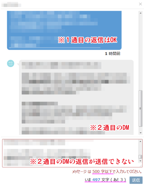 当方がアップロードしている素材に関して、ユーザーの方からDMを頂きました。 最初に来たDMには、普通に返信が出来たのですが 2通目のDMには何度やっても「文字数オーバー」と出てきてしまい送信できません。 もちろん、文字数は500文字以内に収めています。 ![]() 一応調べてみたところ、DMでのやりとりは 相互フォロー同士でしか出来ないとありました。 しかし一般ユーザーさんのほうは、 素材をアップロードしているユーザーさんに対し 各素材のダウンロードページ下部にある『ダイレクトメッセージ』の ボタンをクリックすれば何度でも送れるのでしょうか? それに対し、DMの受け取り側は、 相手が素材をアップロードしているユーザーではない限り 1回だけしかDMの返信をすることは出来ないのですか? 2通目からのお返事ができず、困っております…; お忙しい中、大変恐縮ですが、ご回答頂けますと幸いです。 ---------------------------------------------------- ■Webブラウザ InternetExplorer7( ) InternetExplorer8( ) InternetExplorer9( ) InternetExplorer10( ) Internet Explorer11( ) Microsoft Edge( ) Firefox( ○ ) Google Chrome( ○ ) Safari( ) その他( ) ■OS Windows XP( ) Windows Vista( ) Windows 7 ( ○ ) Windows 8( ) Windows 8.1( ) Windows 10( ) MacOS X 10.5( ) MacOS X 10.6( ) MacOS X 10.7( ) MacOS X 10.8( ) MacOS X 10.9( ) MacOS X 10.10( ) MacOS X 10.11( ) mac OS 10.12( ) mac OS 10.13( ) その他( ) ---------------------------------------------------- |