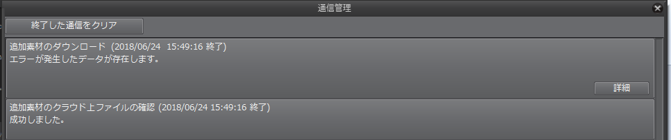 [通信管理]画面のスクリーンショットとそのエラーに[詳細]ボタンが