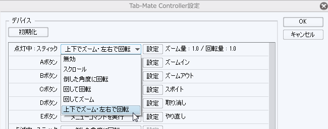 [Tab-Mate Controller設定]を開き、スティックの設定を変更してご希望の動作になるか