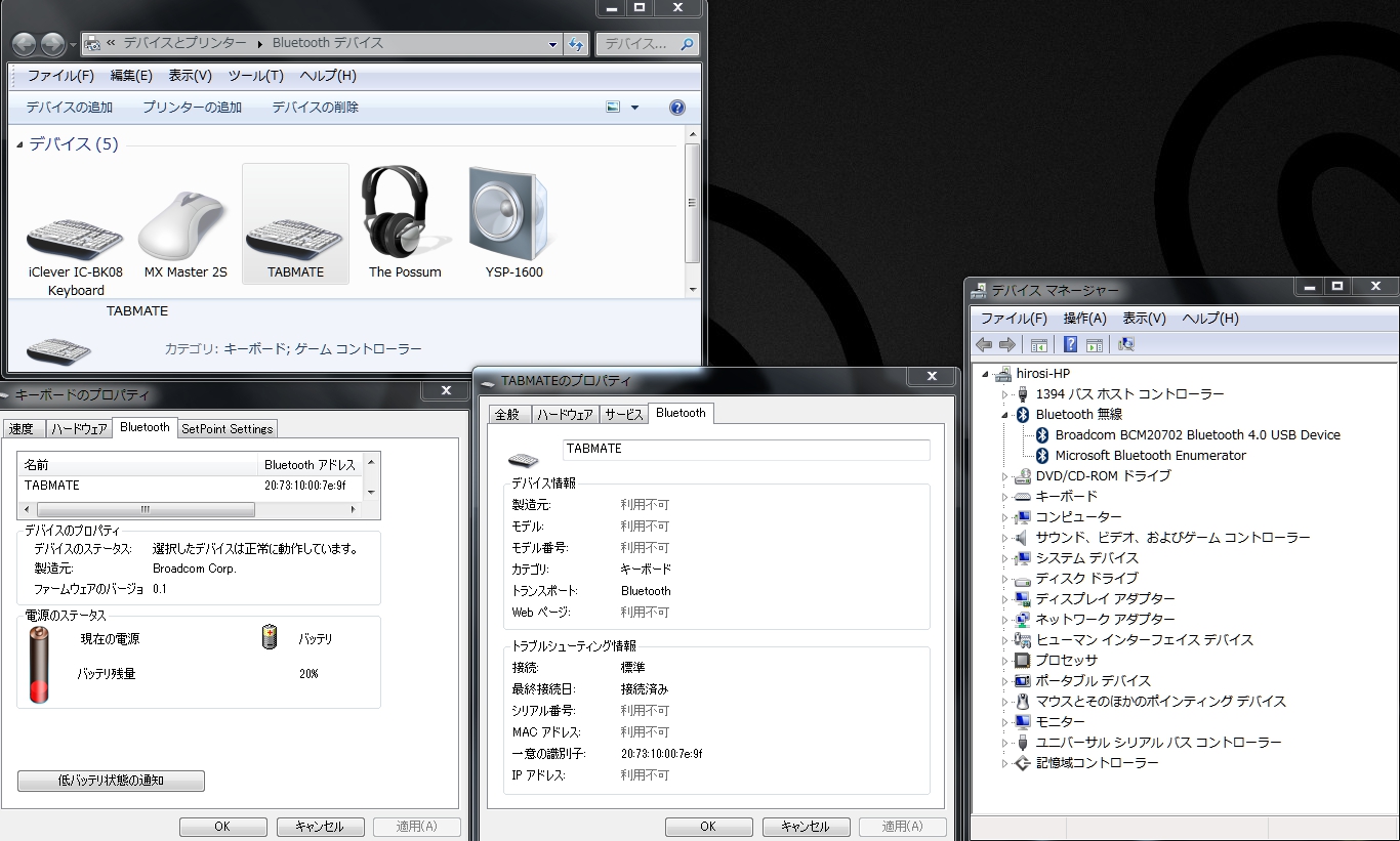 お世話になっています。 一昨日、TABMATEを買ってきて、ペアリングしました。 ソフトウェアを初めてDLし立ち上げましたが、 ファイル→CLIP STUDIO TABMATE→設定がグレーアウト になっています。 ・環境はwin7 64bt(最新の状態) ・CLIP STUDIOは最新のver1.8.0 ・使用しているBluetoothアダプタは、 I-O DATA Bluetoothアダプター Class 2対応 4.0+EDR/LE対応 USBアダプター USB-BT40LE になります(PCは元々Bluetooth機能がついていないものです) ・接続ポートはUSB2.0 ・セキュリティソフトはいれてません ・他の全てのBluetooth機器は正常に使用できてます(タブメイトもペアリングはすんなり出来ます。赤青の点滅から赤になります) ・コントロールパネル→ハードウェアとサウンド→デバイスとプリンターの一覧と、 タスクトレイのBluetoothのアイコン右クリック→Bluetoothデバイスの表示、どちらにもタブメイトはちゃんと表示されています。 やったこと ・PC再起動 ・Bluetoothアダプタの挿し直し、ドライバ削除再インストール ・ソフトウェアのアンインストール再インストール ・ペアリングする際はソフトウェアを終了している状態です。念のため立ち上げてやってみましたが変化なしです。 ・電源の管理の画面で、電力の節約のために、コンピューターでこのデバイスの電源をオフできるようにする、のチェックを外す ・https://www.clip-studio.com/clip_site/support/request/detail/svc/80/tid/96497 にある、 「[TABMATE]の電源をCLIP STUDIOボタン長押しで落としていただいた上で、 掲載いただいた1枚目の画像の画面で[デバイスの削除]を行い、 CLIP STUDIOボタン長押しで電源を入れ、LEDが赤青点滅になりましたら、 同画面の上部の[Bluetoothまたはその他のデバイスを追加する]を クリックし、[デバイスを追加する]画面で[Bluetooth]を選択し、 [TABMATE]と表示されたら、そちらをクリックして選択します。」 も試しました。 気になる点 ・デバイスとプリンター→Bluetoothデバイス→タブメイトを右クリックしキーボード設定→Bluetoothタブで、タブメイトのバッテリ残量がなぜか20%(同梱されていた新品の電池です) 別のフル充電のエネループに変えても15%でした。 以上になります。 お手数をおかけしますが、 ご回答をよろしくお願い致します。 ![]() ![]() ![]() ------------------------------------------------------------ ■使用ソフトウェア ComicStudioEX( ) ComicStudioPro( ) IllustStudio( ) CLIP STUDIO PAINT( ○ ) 六角大王Super( ) バージョン:1.8.0 ※[ヘルプ]メニュー→[バージョン情報]で確認できます。 ■OS Windows XP( ) Windows Vista( ) Windows 7 ( ○ ) Windows 8( ) Windows 8.1( ) Windows 10( ) MacOS X 10.5( ) MacOS X 10.6( ) MacOS X 10.7( ) MacOS X 10.8( ) MacOS X 10.9( ) MacOS X 10.10( ) MacOS X 10.11( ) mac OS 10.12( ) mac OS 10.13( ) その他( ) ------------------------------------------------------------ |