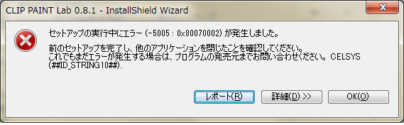 ![]() PC不具合のためシステムの復元をしたところ、過去にアンインストールした0.8.1が復活したのですが 起動もアンインストールもできなくなりました。復元後に新たにインストールした0.8.4は正常に動きます。 詳細には エラーコード: -5005 : 0x80070002 エラー情報: >Kernel\KernelMedia.cpp (95) >SetupNew\setup.cpp (851) PAPP:CLIP PAINT Lab 0.8.1 PVENDOR:CELSYS (##ID_STRING10##) PGUID:002F0EEF-43B3-48D9-A62E-18F471F1A0C9 $15.0.0.498 @Windows Vista Service Pack 1 (7601) IE Version: 9.0.8112.16421 のエラー情報がありますが、どうしたらアンインストールできるのでしょうか。 ----------------------------------------------------------- ■CLIP PAINT Labのバージョン 0.8.0( ) 0.8.1( ○) 0.8.2( ) 0.8.3( ) 0.8.4( ) ■OS Windows XP( ) Windows Vista( ) Windows 7( ○ 64bit) Mac OS 10.5( ) Mac OS 10.6( ) Mac OS 10.7( ) その他( ) ----------------------------------------------------------- |