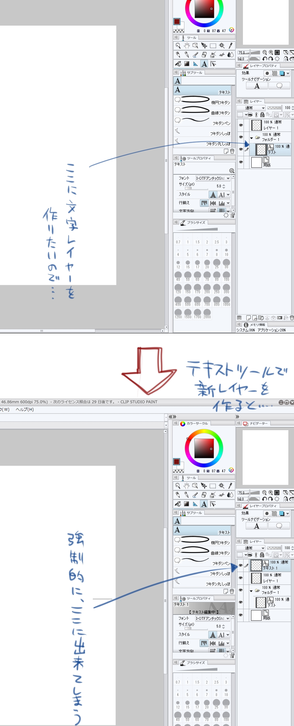 お手数おかけしますが、以下の操作にてレイヤーフォルダ内に新規テキストレイヤーが
