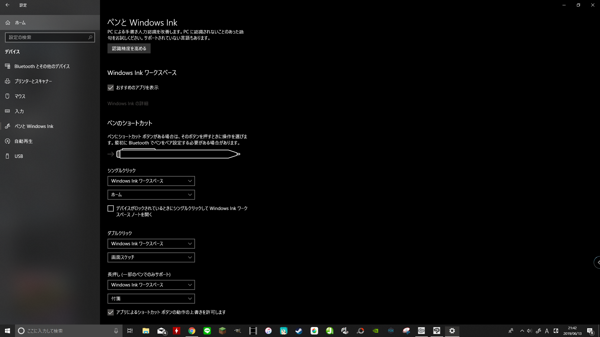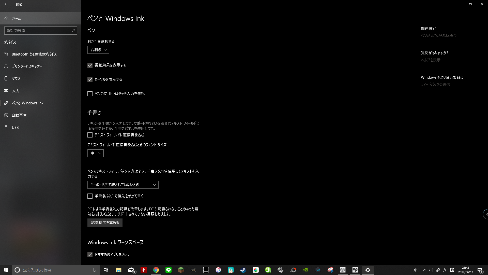 左側で[ペンとWindows Ink]の順に選択すると表示されるページのすべての