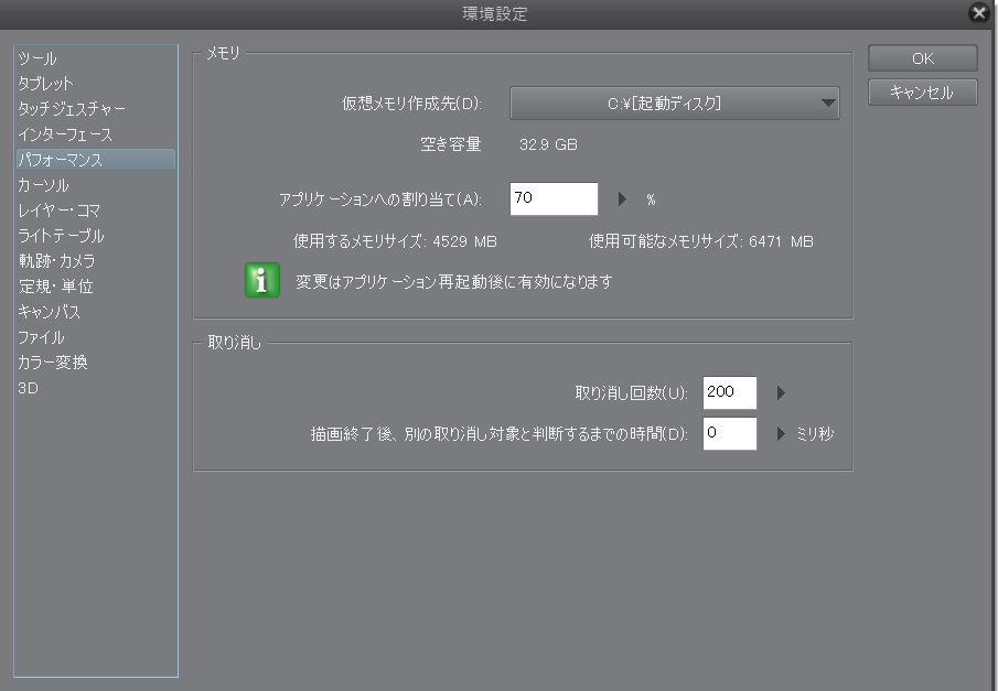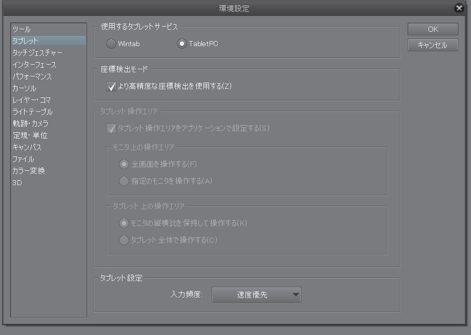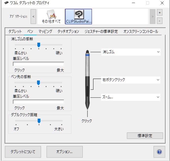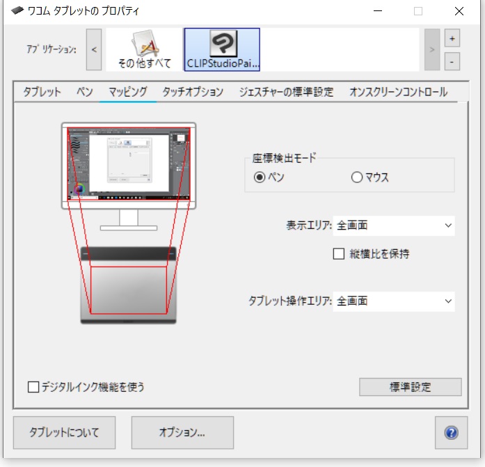 *[ファイル]メニュー→[環境設定]→[タブレット]を選択いただき、表示される