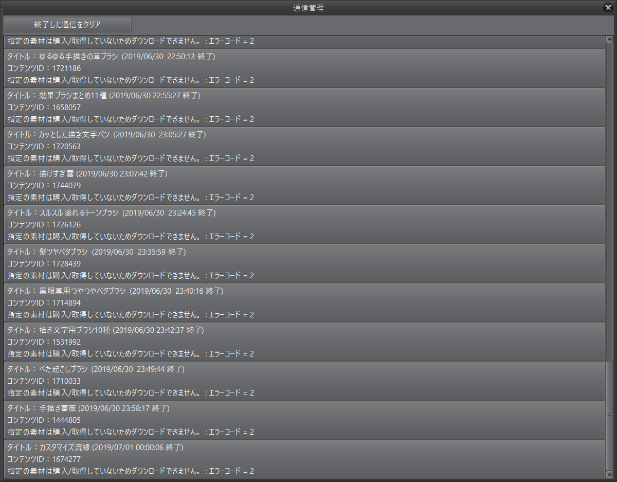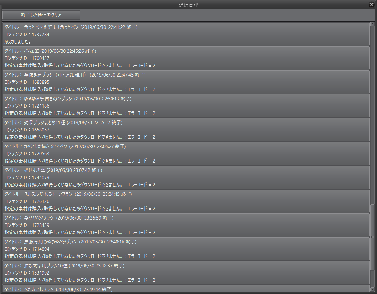 6月30日までのCLIPPYを使用して素材を購入しましたが、 以下のスクリーンショットのエラーメッセージが出てダウンロードができません。 無料の素材も取得しましたが、同様です。 作業は時間ギリギリまで行っていました。 スクリーンショット1枚目、一段目、22:41:22終了の素材まではすべて成功しており、 これ以降は最後まで失敗している状態です。 なお、日付が7/1になった後に取得した無料素材は正常にダウンロードできていました。 CLIPPYは減っています。 素材はダウンロードできるのでしょうか? ![]() ![]() ------------------------------------------------------------ ■バージョン:1.8.8 ※Windowsは、[ヘルプ]メニュー → [バージョン情報]で確認できます。 ※MacOSXは、[CLIP STUDIO PAINT]メニュー → [バージョン情報]で確認できます。 ※iPadは、[CLIP STUDIO PAINT]アイコン → [バージョン情報]で確認できます。 ■グレード DEBUT( ) PRO( ) EX( ○ ) ■OS Windows 7 ( ) Windows 8( ) Windows 8.1( ) Windows 10( ○ ) MacOS X 10.10( ) MacOS X 10.11( ) macOS 10.12( ) macOS 10.13( ) macOS 10.14( ) iOS 11( ) iOS 12( ) その他( ) ------------------------------------------------------------ |
