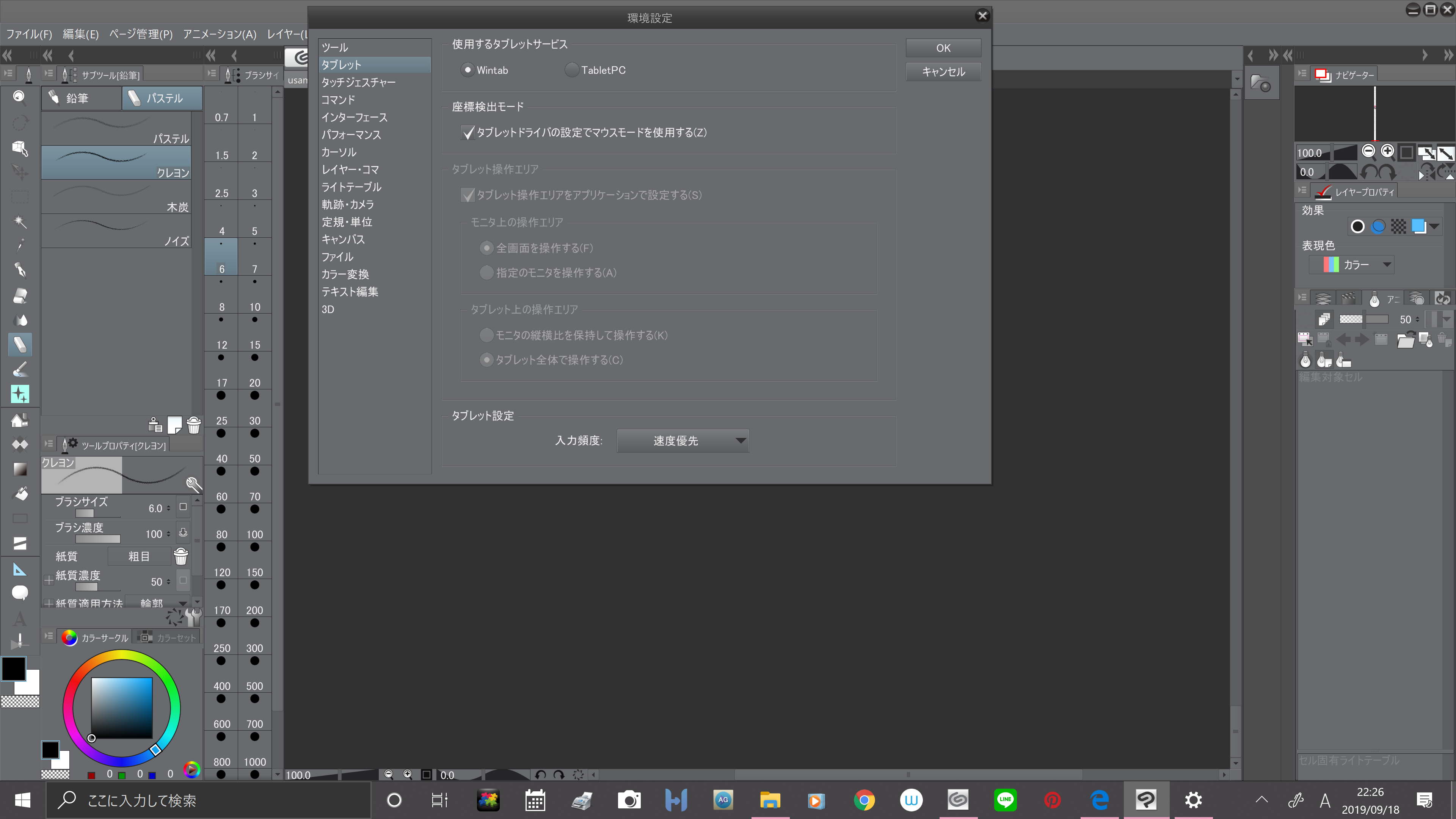 [環境設定]を選択し、表示される画面左側の[タブレット]を選択し、画面右側で