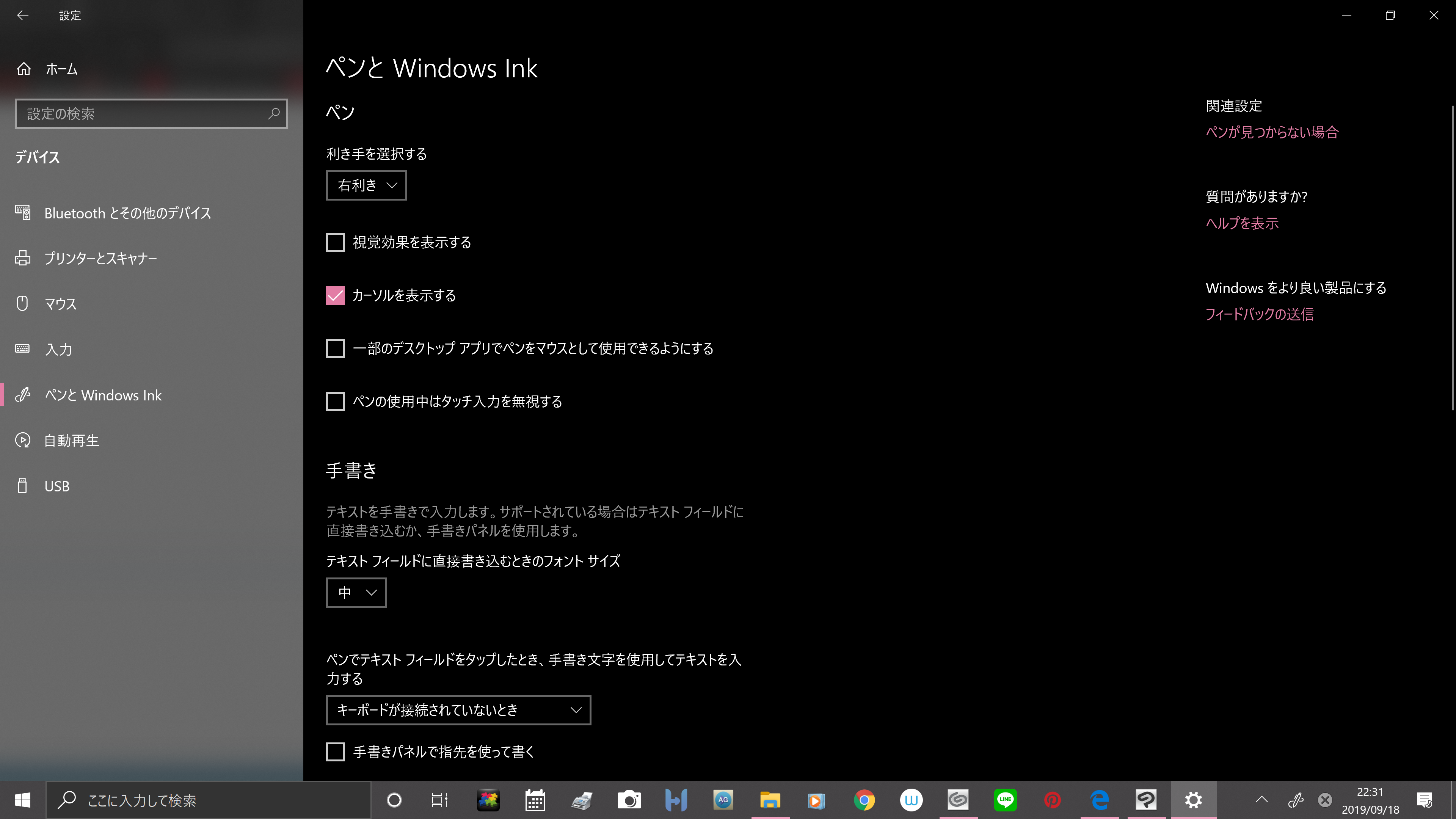 左側で[ペンとWindows Ink]の順に選択すると表示されるページのすべての