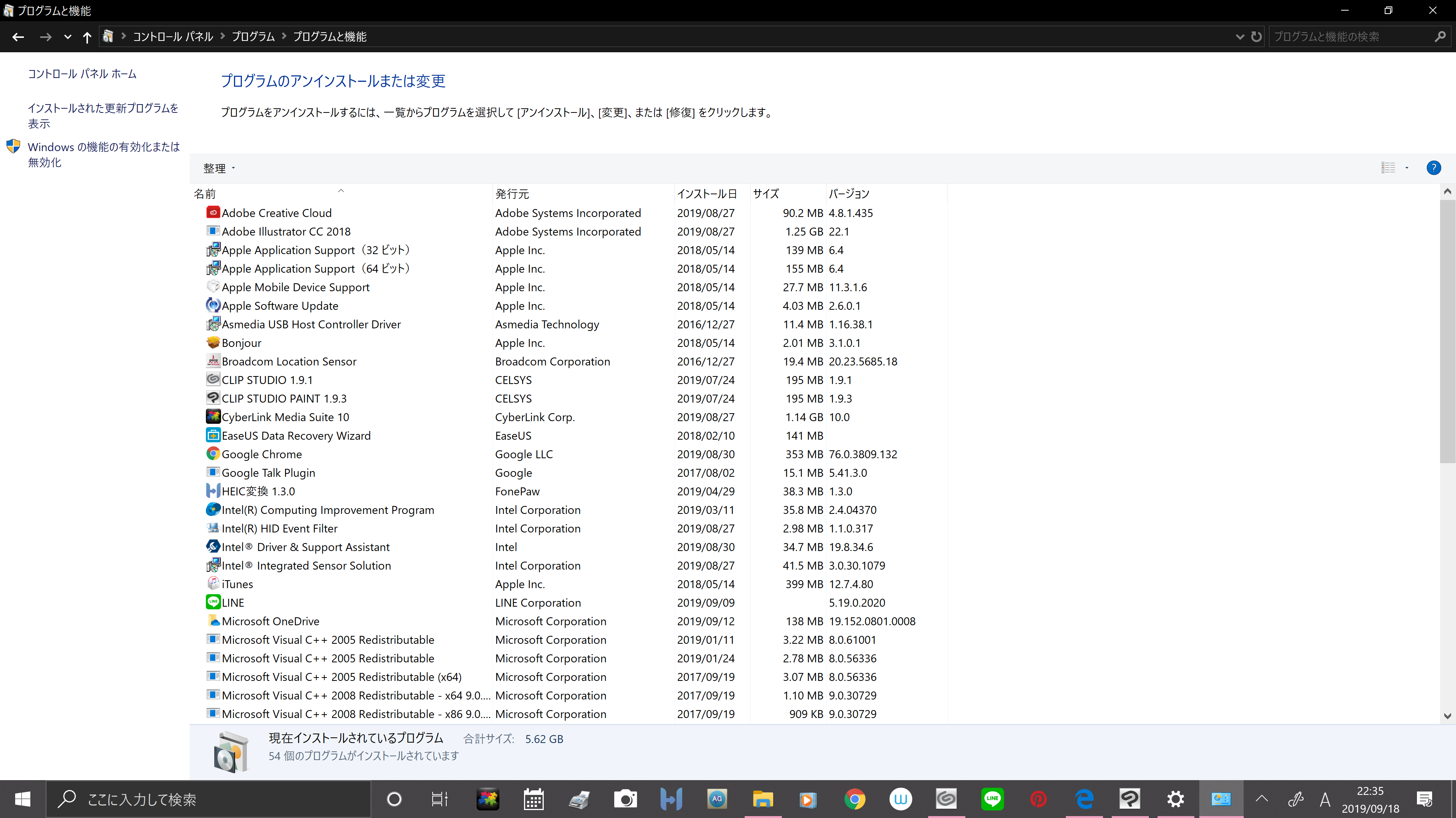 (プログラムと機能)]を選択して表示される画面のすべての項目が