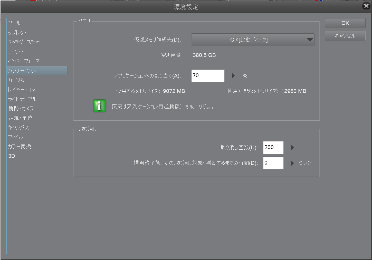 [ファイル]メニューの[環境設定]を選択し、表示される画面の左側で