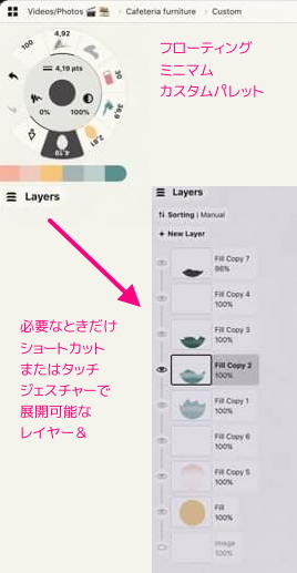 お世話になっております。 Windows10タッチパネル端末・Apple macOS 10.15 Sidecarに最適化されたUIミニマムモード(カスタムパレット)・.Too Copic 2019カラーシステムデジタルホイールの純正プラグイン:必要な人だけ選択できる追加機能(有償)対応を希望します。 デスクトップアプリではArtRage、Autodesk SkectchBookがタッチUIに対応しています。 現在の使用でもショートカットキー1つでパネル類の表示を消すことはできますが ・最小限のツールアクセスUIは残して欲しい ・デスクトップ用UIをそのまま液晶タッチUIで扱うのは難しい ・セキュリティ上の理由でTabmateを含む外部入力デバイスやLazy Nezumi Pro(アプリ)が持ち込めない セルシス純正のソフトウェアショートカットUIを提供して欲しい ・右利き・左利きどちらでも使える左右対称UI(設定でショートカット定義を左右反転)が欲しい といったニーズはアンケート調査すればでてくると思います。 以下「Concepts」を例にあげます。 .Too Copicカラーシステム様のタッチホイール 表示サイズはタッチジェスチャーまたは設定で任意変更可 クリスタ標準カラーセットのほか自作カラーセット・彩度/明度グラデーション 使用色履歴・グラデーションマップをポップアップホイールで呼び出し ![]() シースルー&ミニマムレイヤー・カスタムパレットUI 必要なときだけ展開・表示情報は設定で調整・複数設置可 円弧状タッチパネルは「配置の左右反転」設定で右・左利き共通で使える ![]() |