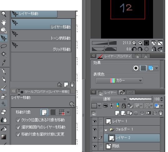 描いて頂き、[操作]ツールの[レイヤー選択]を選択して、レイヤー1、2に
