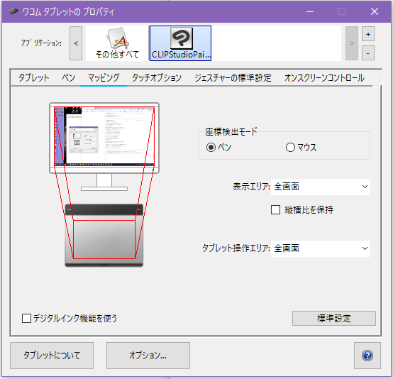 ・[環境設定]-[タブレット]にて[座標検出モード]にチェックが