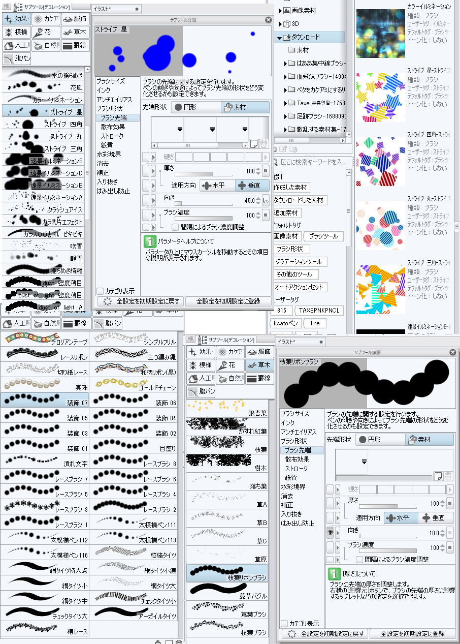 初めまして。 PC初期化後、クリスタを再ダウンロードしたところ、 一部のブラシが黒丸表記、キャンパスに描画時もすべて黒丸になってしまう 現象が起こってしまって、再ダウンロードや素材の再構築などしてみても直りません。 過去にもいくつかこの現象の事例があったようで、 そちらの対処法なども見ていたのですが、 大分バージョンも進んでしまっていて、 最近のバージョンでの対処法が見つからなかったので 解決方法があれば教えて頂きたいと思い投稿させて頂きました。 現象としてはこちらの投稿とほぼまったく同じ状態です。 すみませんが、よろしくお願いします。 ------------------------------------------------------------ ■バージョン: ※Windowsは、[ヘルプ]メニュー → [バージョン情報]で確認できます。 ※MacOSXは、[CLIP STUDIO PAINT]メニュー → [バージョン情報]で確認できます。 ※iPadは、[CLIP STUDIO PAINT]アイコン → [バージョン情報]で確認できます。 ■グレード DEBUT( ) PRO( ) EX( 〇 ) ■OS Windows 7 ( ) Windows 8( ) Windows 8.1( ) Windows 10( 〇 ) MacOS X 10.10( ) MacOS X 10.11( ) macOS 10.12( ) macOS 10.13( ) macOS 10.14( ) iOS 11( ) iOS 12( ) その他( ) ------------------------------------------------------------ |