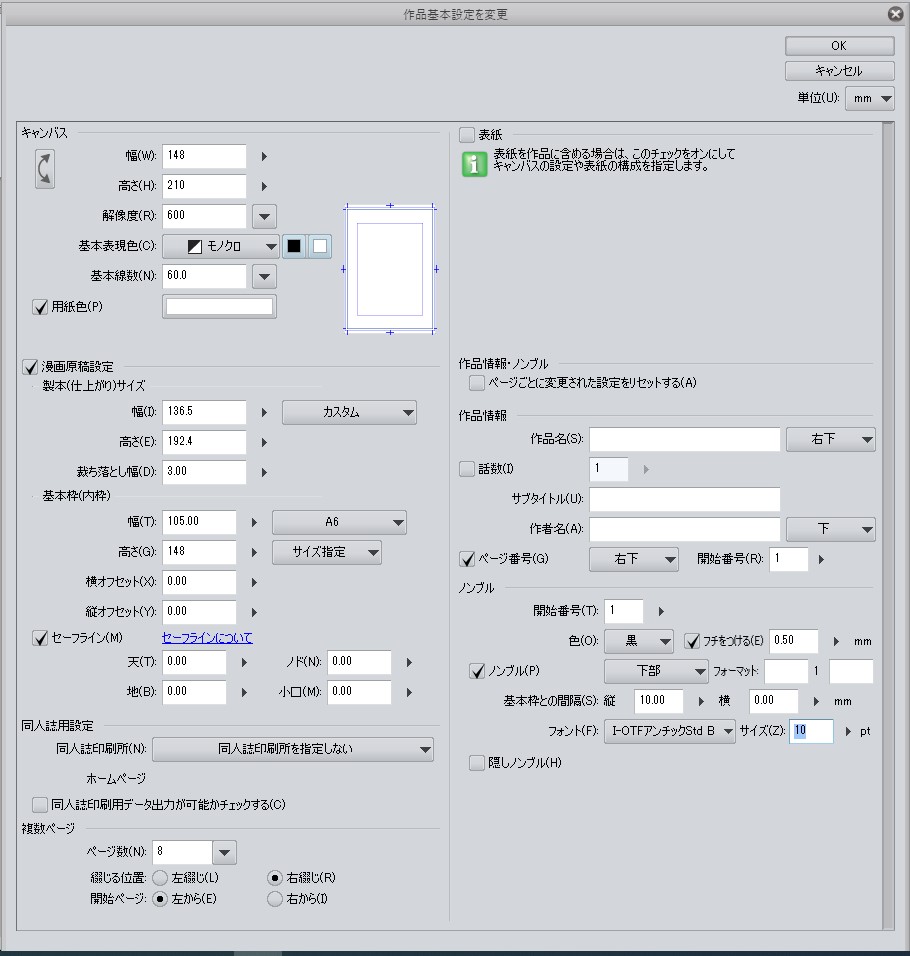 文庫本A6の原稿設定はクリスタのテンプレートと少し違います。
