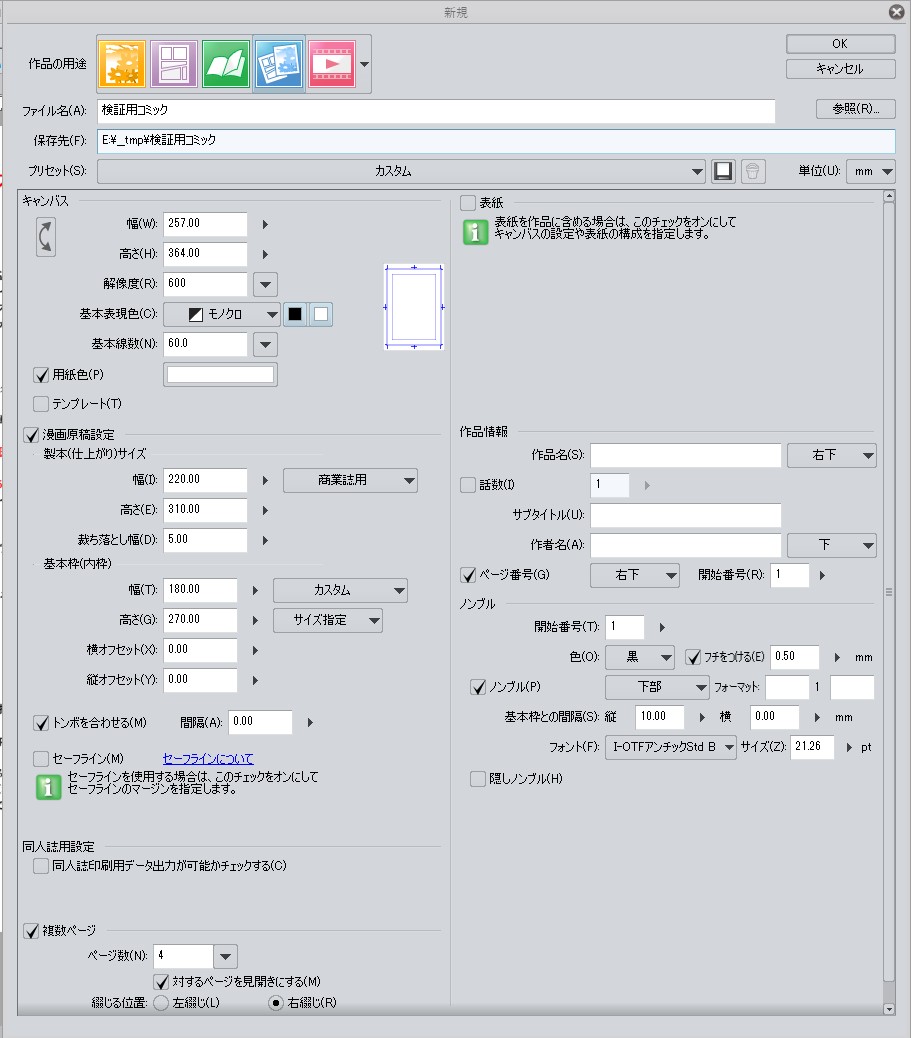 この為、[ファイル]メニューの[新規]から複数ページ作品を作成し、