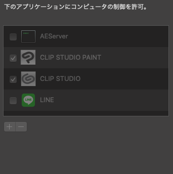 入力監視の許可リストにクリップスタジオペイントが追加されません。(そもそも表示されません) ------------------------------------------------------------ ■バージョン: ※Windowsは、[ヘルプ]メニュー → [バージョン情報]で確認できます。 ※MacOSXは、[CLIP STUDIO PAINT]メニュー → [バージョン情報]で確認できます。 ※iPadは、[CLIP STUDIO PAINT]アイコン → [バージョン情報]で確認できます。 ■グレード DEBUT( ) PRO( ) EX( ) ■OS Windows 7 ( ) Windows 8( ) Windows 8.1( ) Windows 10( ) MacOS X 10.10( ) MacOS X 10.11( ) macOS 10.12( ) macOS 10.13( ) macOS 10.14( ) macOS 10.15( ) iOS 11( ) iOS 12( ) iPadOS 13( ) その他( ) ------------------------------------------------------------ |