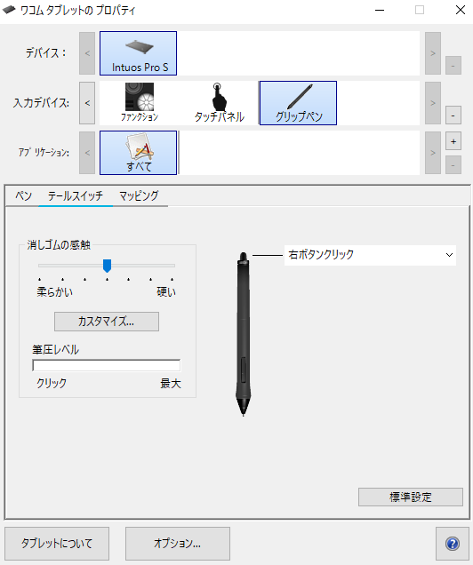 恐れいりますが、タブレットドライバで[テールスイッチ]に[右ボタンクリック]を