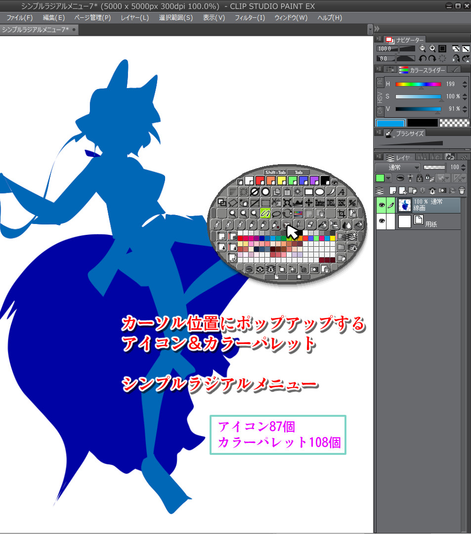 レイヤーも数が増えてくると選択が繁雑になりますからタグなりアンカーを設定して(「主線」「肌色」「調整レイヤー」「○○定規」またはレイヤーフォルダそのもの)ルーレットメニューからアクセスできれば画面の端から端へ腕・手・指を走らせる回数が減ります。