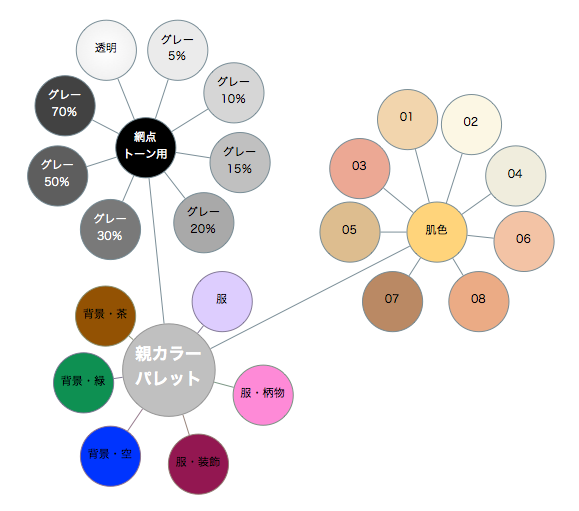 入れ子構造は子カラーパレットを選択すると親パレットと同じ位置で入れ替わる様になればペン先の移動も最小限になります。