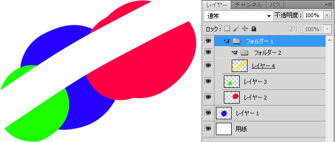 また上記の例の場合、レイヤー2とレイヤー3は、フォルダーから出した後レイヤー1に対してクリッピングさせれば