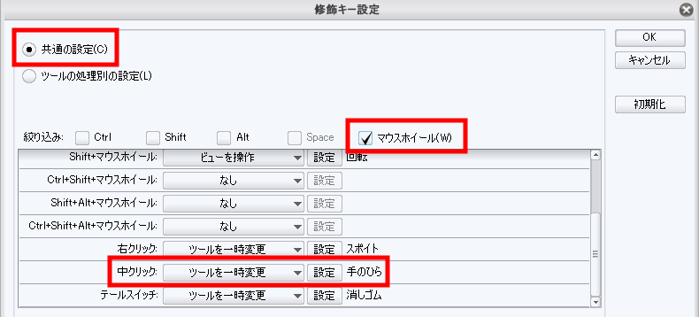 [共通の設定]のラジオボタンを選択し、[絞り込み]で[マウスホイール]に