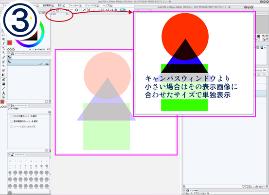 >単独表示する元のキャンバスウィンドウのエリアよりも表示画像が小さい場合に