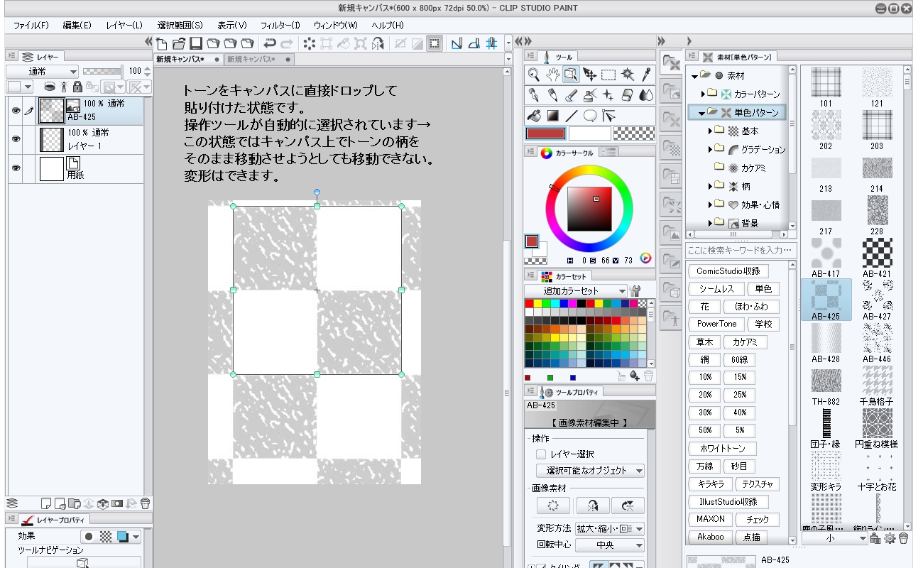 トーンから[素材]パレットを貼り付ける場合、トーンを貼る場所の選択範囲を取らずに、