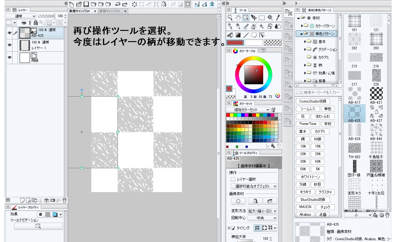 1.素材ウィンドからトーンをドロップ。そのままレイヤー画面をドラックしてもレイヤーを移動することはできない。 2.レイヤー選択ツールを選択。レイヤーを操作して、移動させる 3.操作ツールに戻る。今度はレイヤーが移動できる。 4.そのままレイヤーを何度か移動させていると、ある程度操作した時点でレイヤーが移動できなくなる
