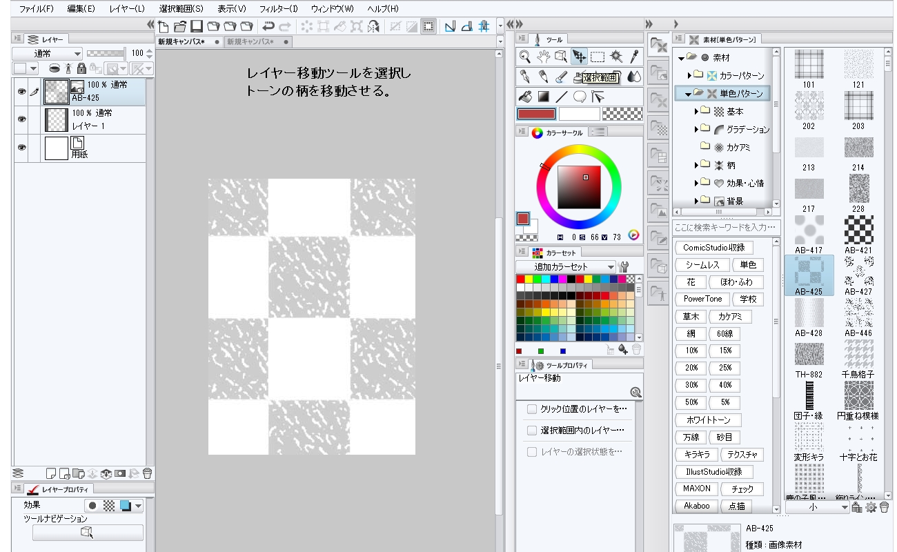 トーン(網点)の柄の移動となりますとレイヤープロパティの[トーン]にある[網の位置(X)]