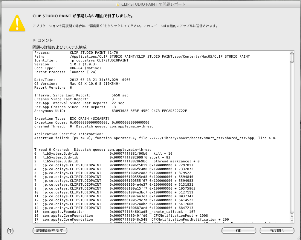 体験版を使用していたところ、急に固まり完全に動かなくなりました。 仕方なくMacを再起動させ、立ち上げましたが ソフト自体エラーで立ち上がらなくなりました。 (予期しない理由で終了しました、と出ます) 動作も異常に重いし使いづらいです。 Macのバグか仕様でしょうか? (adobe製品は普通に使えます) あと、ショートカットキー長押しで他のツール使用→ はずすと元のツールに戻るという使い方 (例えばペンを使っていて、Eを長押ししたままで消しゴム使用、 キーボードを外してまたもとのペンを使用、という使い方) をしているのですが、1動作してすぐ手を外すと元に戻りません。 2動作以上してから手を外すともとのツールに戻って使えます。 この仕様?も使いづらくて仕方ないのですがなんとかなりませんか。 購入を考えていましたが、改善されないようならあきらめます・・・ 500G購入してしまいましたが返金はムリですよね・・・ ------------------------------------------------------------ ■バージョン: ※[ヘルプ]メニュー→[バージョン情報]で確認できます。 ■OS Windows XP( ) Windows Vista( ) Windows 7( ) MacOS X 10.5( ) MacOS X 10.6( ○ ) MacOS X 10.7( ) MacOS X 10.8( ) その他( ) ------------------------------------------------------------ |