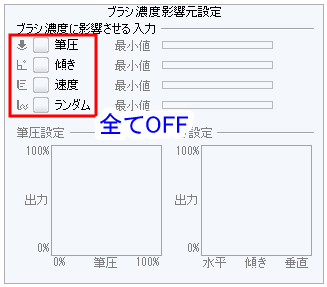 ブラシ濃度影響元設定のチェックを全て無効にします。