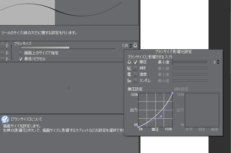 ・線を描くのに用いたペンのブラシサイズと筆圧グラフの設定
