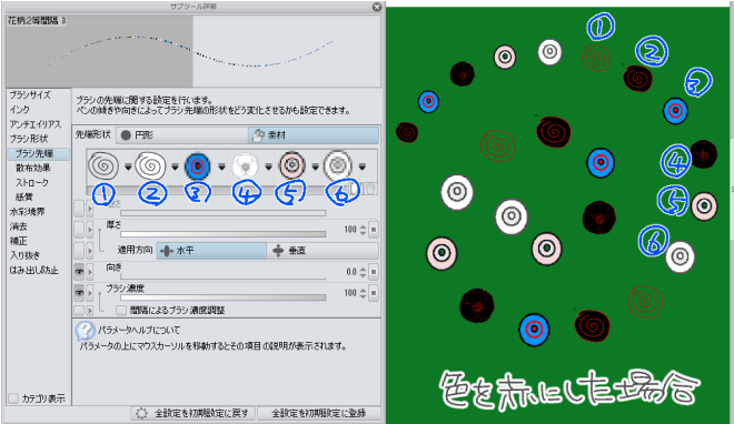 いつもお世話になります。 デコレーションブラシですが、白黒のものだけ、白が黒く表示されるようになってしまいました。 真っ黒の先端素材や、少しでも色が混じると大丈夫です(④は公式素材です) TEMPのフォルダ内削除と、素材の初期化・データベースの再構築は行ってみました。 これより前に現象が発生したかどうかは判りません・・・ もし改善方法ありましたら教えてください。 ![]() ------------------------------------------------------------ ■バージョン: ※[ヘルプ]メニュー → [バージョン情報]で確認できます。 ■グレード PRO( ) EX(〇) ■OS Windows XP( ) Windows Vista( ) Windows 7 (〇64bit) Windows 8( ) MacOS X 10.5( ) MacOS X 10.6( ) MacOS X 10.7( ) MacOS X 10.8( ) その他( ) ------------------------------------------------------------ |