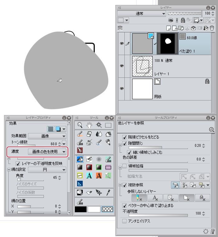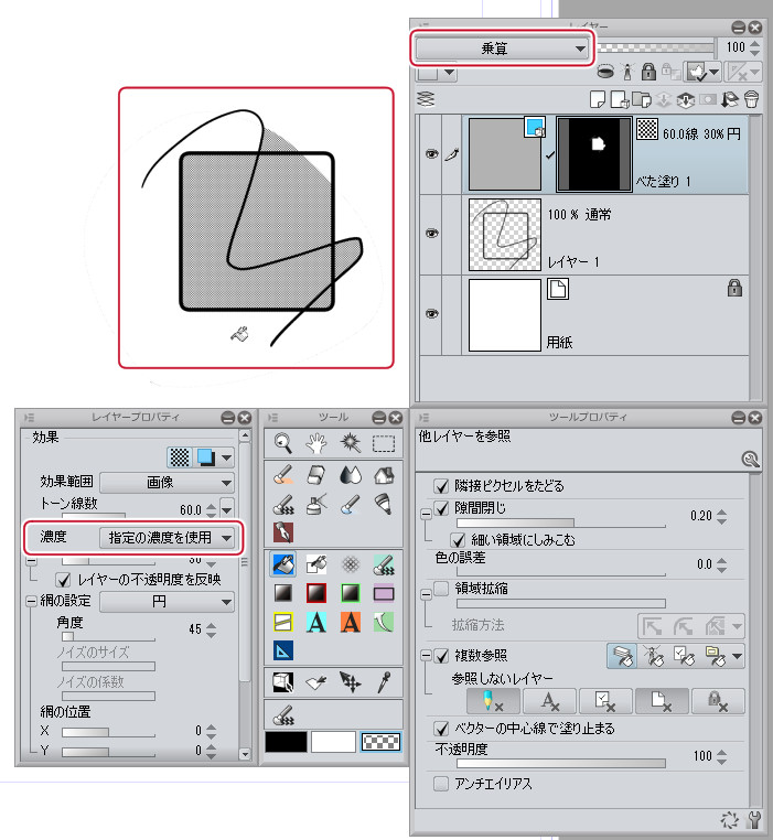 トーンレイヤーの合成モードを「乗算」などに変更すれば、トーンレイヤーのプロパティで「濃度:指定の濃度を使用」などでも、下に重なっている線を認識してくれるようになりますが、レイヤーのトーン化の際、「画像の輝度を使用」や「指定の濃度を使用」の場合は、レイヤー合成モードが「通常」でもキャンバス上では重なっている線も見えていますので、自動選択、塗りつぶしなどのツールも、この見えている線を認識して欲しいと思います。今後修正していただければと思います。 どうぞよろしくお願いいたします。 ------------------------------------------------------------ ■バージョン:CLIP STUDIO PAINT Ver.1.2.3