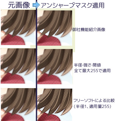 アンシャープマスクがどう考えても機能していません 御社の機能紹介画像でテストしました ![]() 正直、納期に間に合わなかった為に 紹介画像を偽造したんじゃないかと疑いたくなる結果です それとテキストの「全設定を初期設定に登録」も まるで機能していないように思えます 他のツールも恐らく同様です ------------------------------------------------------------ ■バージョン:1.2.3 ※[ヘルプ]メニュー → [バージョン情報]で確認できます。 ■グレード PRO( ○ ) EX( ) ■OS Windows XP( ) Windows Vista( ) Windows 7 ( ○ ) |