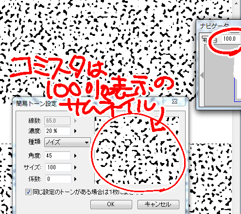 コミスタも表示倍率によって違いますが、貼りこむ際の簡易トーン設定のサムネイルはきちんと100%の時のものになっているのです。出来ればこの様にして欲しいのですが・・・・・。