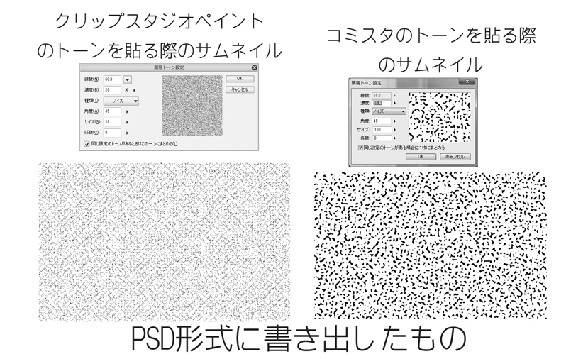 コミスタの頃から倍率によってトーンの見え方が違うのは仕様だったのでそれは別にいいのですが、トーンを貼りこむ際のサムネイルは100%表示のものにしないと、トラブルになる様な気が致します。