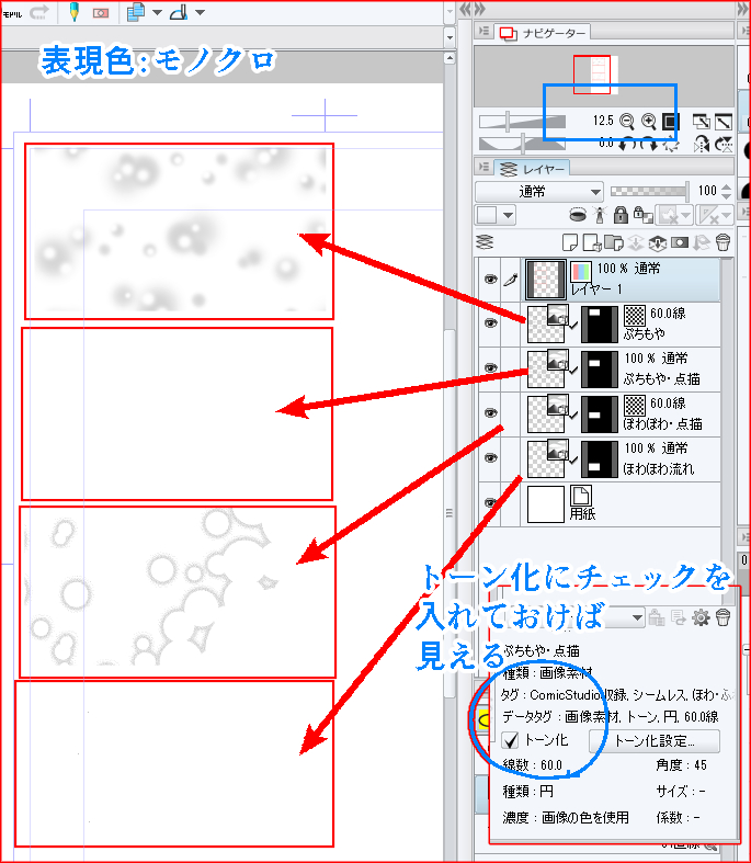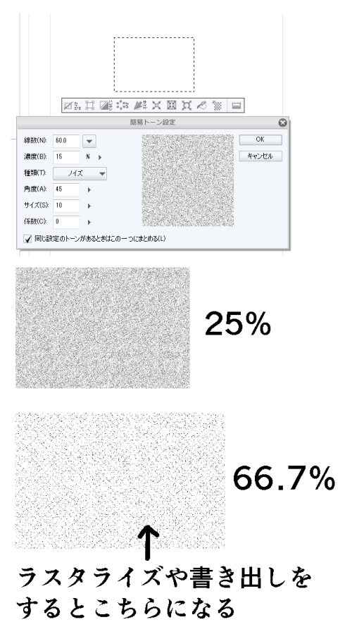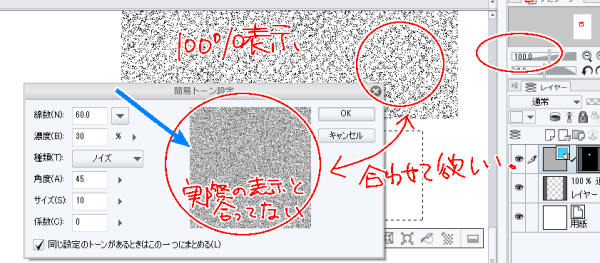 例えば簡易トーン設定の際に表示されている下図青矢印のサムネイルの部分と100%で表示されてるトーンが違うので、そうなってしまうと勘で貼り付けるか、一度貼り付けて見ないと判りません。少なくとも私は青矢印の部分を見ながら濃度を調整して貼りこんでいるのですが・・・