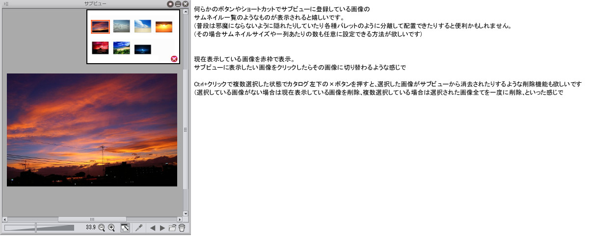 ![]() 言葉だけだとわかりづらいかと思ったので画像での一例のようなものを載せておきます 自分の中でのイメージ的なものですが、こんな感じでサブビューに登録されている画像の表示、削除などに関しての利便性向上を希望します 現状のサブビューパレットだと、現在表示されている画像の前後にどの画像があるかが判らず、またユーザー側で画像の順序を把握していても、前/次の画像ボタンをクリックしないと目的の画像まで移動する事ができず 複数枚をサブビューに登録していた場合手間がかかるのでダイレクトに目的の画像を視認、選択、表示させられるような方法が欲しいです この画像のようなUIではなくても構わないので ”現在サブビューに登録している画像の一覧を確認する事ができる方法” ”サブビューに表示したい画像をお手軽に表示させる事ができる方法(この場合では画像一覧表示→選択、の2ストローク)” ができる方法を追加して頂ければと思います。ご検討頂けますでしょうか ・以下画像内の文章と同一のものになります。 何らかのボタンやショートカットでサブビューに登録している画像の サムネイル一覧のようなものが表示されると嬉しいです。 (普段は邪魔にならないように隠れたりしていたり各種パレットのように分離して配置できたりすると便利かもしれません。 (その場合サムネイルサイズや一列あたりの数も任意に設定できる方法が欲しいです) 現在表示している画像を赤枠で表示。 サブビューに表示したい画像をクリックしたらその画像に切り替わるような感じで Ctrl+クリックで複数選択した状態でカタログ左下の×ボタンを押すと、選択した画像がサブビューから消去されたりするような削除機能も欲しいです (選択している画像がない場合は現在表示している画像を削除、複数選択している場合は選択された画像全てを一度に削除、といった感じで ------------------------------------------------------------ ■バージョン:1.2.3 ※[ヘルプ]メニュー → [バージョン情報]で確認できます。 ■グレード PRO( ○ ) EX( ) ■OS Windows XP( ) Windows Vista( ) Windows 7 ( ○ ) Windows 8( ) MacOS X 10.5( ) MacOS X 10.6( ) MacOS X 10.7( ) MacOS X 10.8( ) その他( ) ------------------------------------------------------------ |
