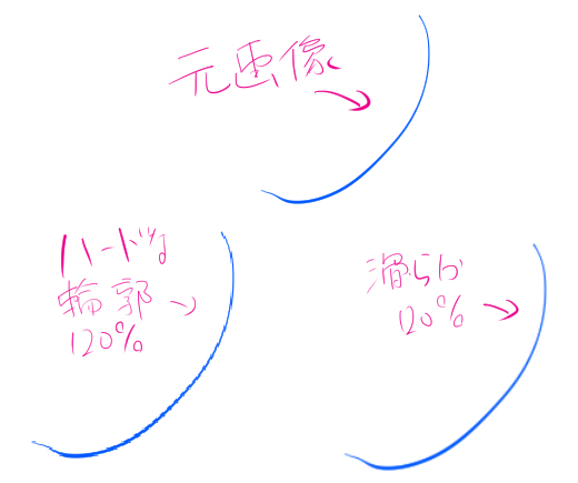 ![]() 「滑らか」(つまりアンチエイリアスON)で変形してしまうと、細部が潰れてしまうので、下書きを変形するときは大抵、「ハードな輪郭」(つまりアンチエイリアスOFF)で変形させてやるだろうと思います。 …なのですが、「ハードな輪郭」での変形は、精度がかなり悪いように思います。 上図を見て下さい。 なぜ、こんなにも線がギザギザになるのか。 「ハードな輪郭」だからなのか。 いや、さすがにこれはひどいだろうと。 「滑らか」の方を二値化したってこうはなりませんよ。 ------------------------------------------------------------ ■バージョン: ※[ヘルプ]メニュー → [バージョン情報]で確認できます。 ■グレード PRO( ) EX( ) ■OS Windows XP( ) Windows Vista( ) Windows 7 ( ) Windows 8( ) MacOS X 10.5( ) MacOS X 10.6( ) MacOS X 10.7( ) MacOS X 10.8( ) その他( ) ------------------------------------------------------------ |