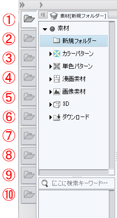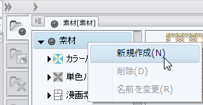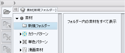2.素材パレットにて以下の画像のようにツリー表示の[素材]の下に[新規フォルダー]