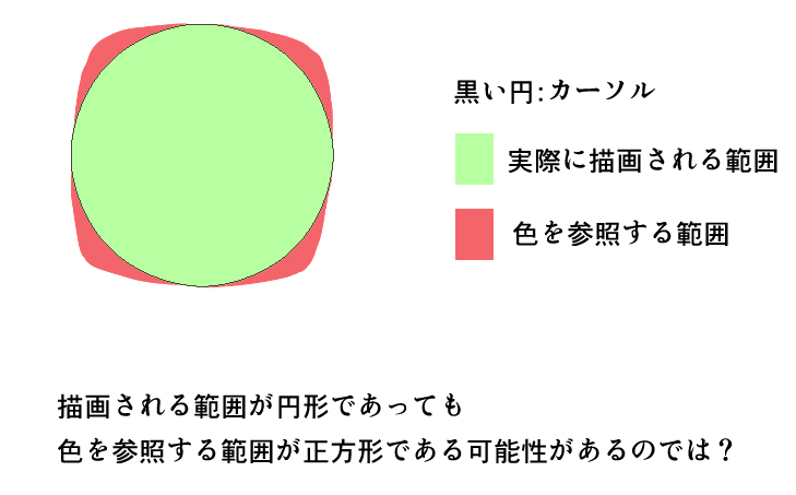 おそらくですが色の参照範囲がブラシサイズより均等に一回り外側とかではなく以下のように
