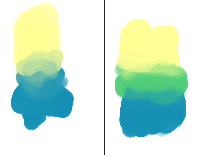 現状ですと絵の具でキャンバスに描く要領で一番下に白く塗ったレイヤーを用意しておくと、その色を拾ってしまい、結果混色時に更に彩度が落ちてしまうということが起きています。